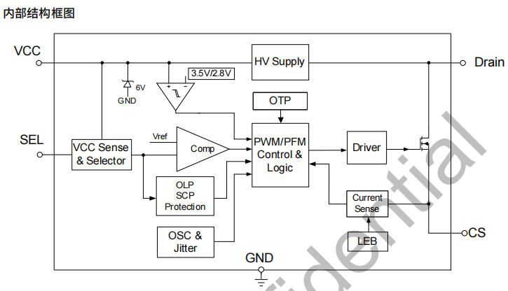 芯片上電后,內部500 V高壓恒流源先把VCC沖到3.5 V,啟動完成后高壓源關斷,由輸出電壓經電感耦合給VCC續電,實現“零輔助繞組”反激式供電;同時采樣VCC跌落,一旦低于3.0 V(3.3 V版本)并持續160 ms,判定輸出過載,進入4 kHz打嗝模式,1.6 s自動重啟。峰值電流比較器僅200 mV閾值,配合250 ns前沿消隱,既能精確限流又不怕DRAIN尖峰誤觸發。溫度檢測位于MOS柵極區,熱阻155 °C/W,確保芯片在塑料外殼密閉環境下也能安全降額。