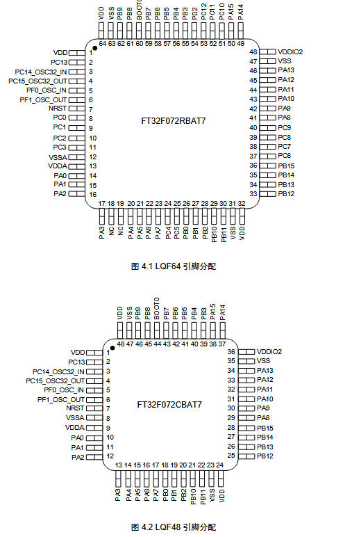 | CBAT7 | LQFP48-7×7 | 128 k/24 k | 37 | 16+6 int | 2/2/3 | 24 | 兼容 STM32F072 48Pin | 6 周 |