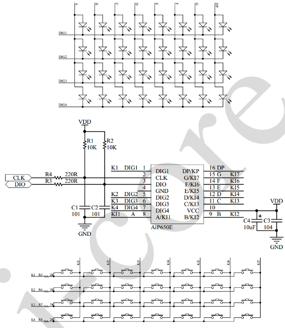 AiP650E的內(nèi)部架構(gòu)體現(xiàn)了"顯示與按鍵分時(shí)復(fù)用"的智能設(shè)計(jì)理念: