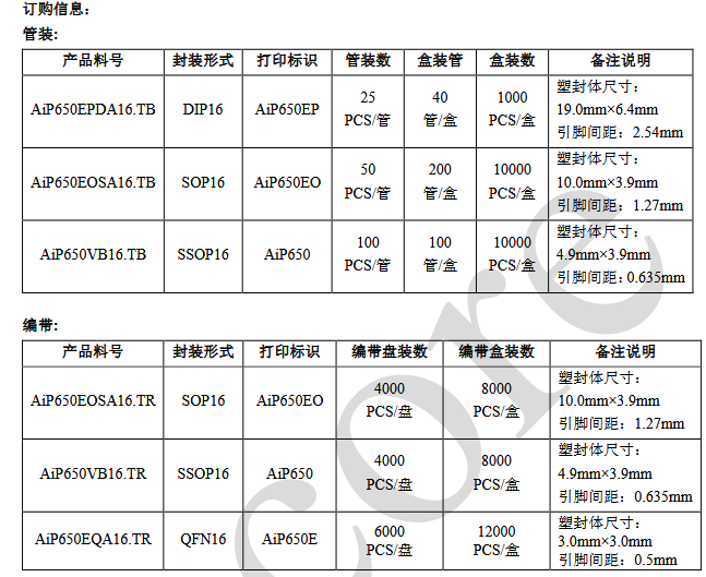 | SSOP16 | AiP650 | 省略封裝標(biāo)識(shí),需結(jié)合外形區(qū)分 |
