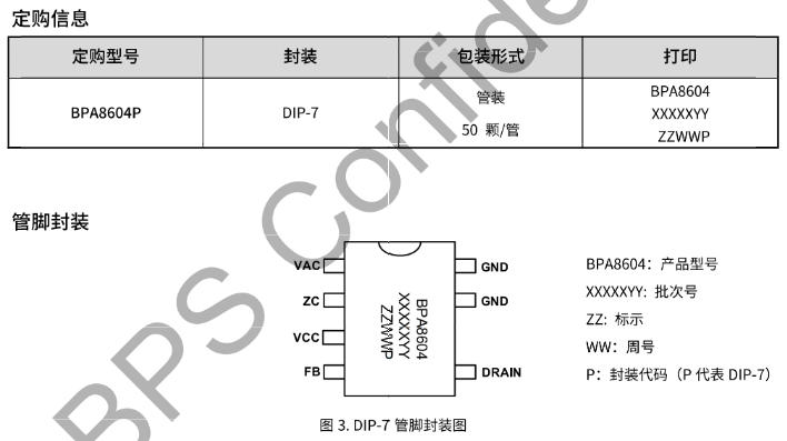 封裝特點: DIP-7比標準DIP-8少一腳,增加DRAIN到GND的爬電距離,適合高壓潮濕環境。