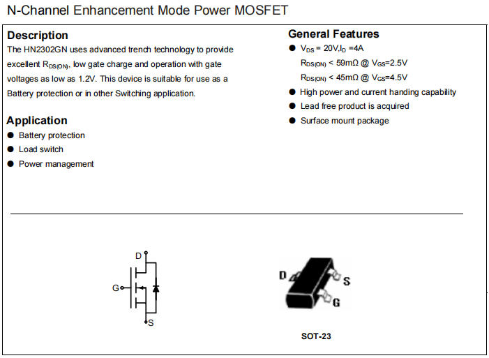 | HN2302GN | 華能 | 45mΩ | 0.5-1.2V | 國產(chǎn)低價(jià),1.2V驅(qū)動(dòng) |