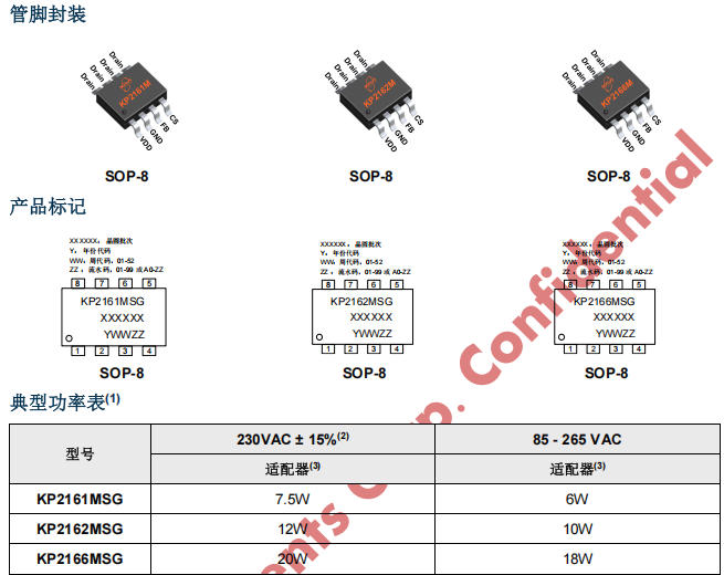 KP216XMSG是必易微(Kiwi Instruments)推出的帶高壓啟動的原邊控制功率開關系列,集成650V MOSFET,采用SOP-8封裝,無需啟動電阻和光耦,專為6W-18W小功率離線式充電器設計。系列包含三款型號,覆蓋不同功率等級: