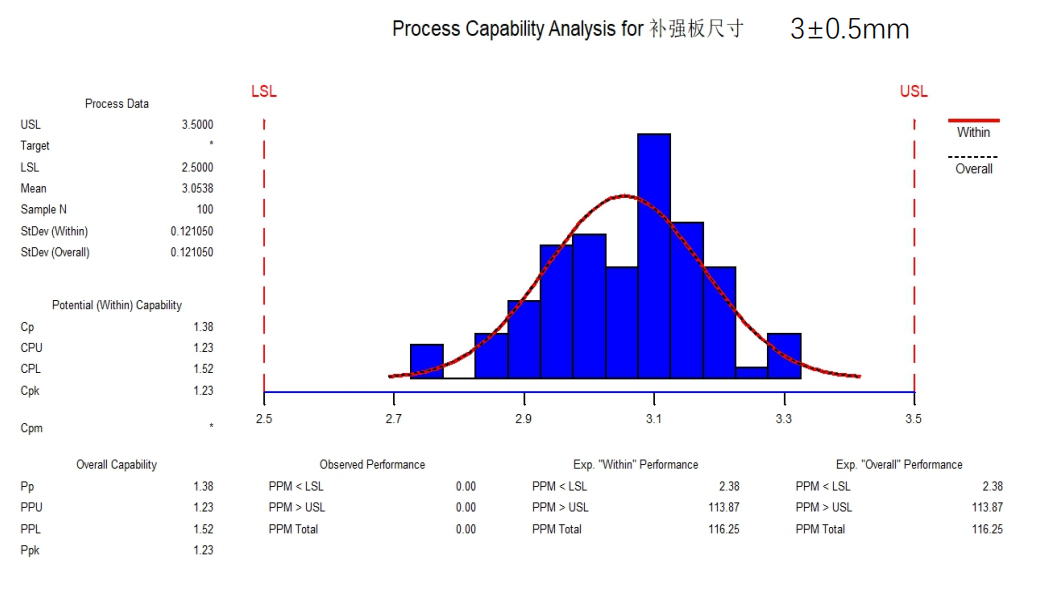 數(shù)據(jù)處理:USL 3.8,LSL 2.2,Mean3.0538,StDev(Within) 0.121050,StDev(Overall) 0.121050。