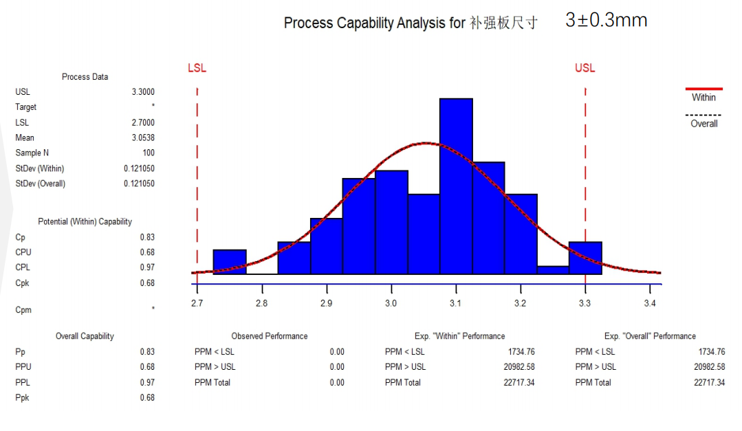 數(shù)據(jù)處理:USL 3.3,LSL 2.7,Mean3.0538,StDev(Within) 0.121050,StDev(Overall) 0.121050。