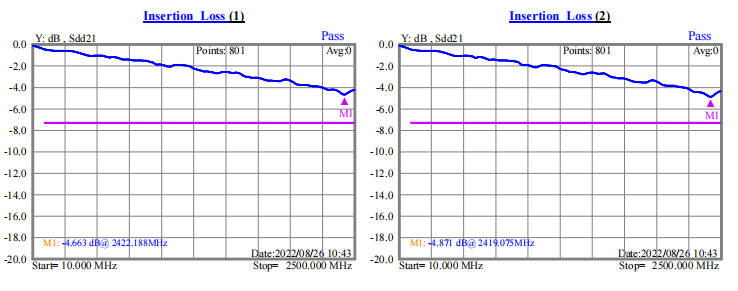 我們以ph0.5-51p-300lvds排線來說明。0.5x51x300xA兩面不貼復合鋁箔,測試結果如下圖(一),0.5x51x300xA單面貼復合鋁箔,測試結果如下圖(二)。