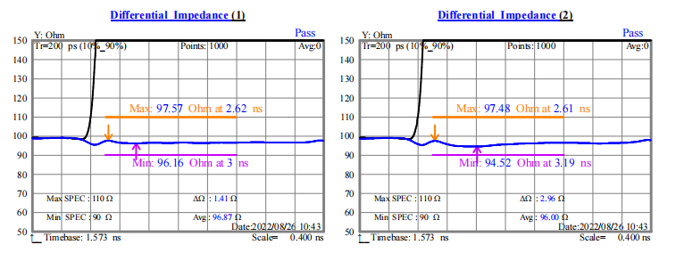 從圖一與圖二數據可以看出,不貼復合鋁箔,排線的特性阻抗平均值為114.6Ω和113.4Ω;貼上復合鋁箔后排線的特性阻抗平均值為96.8Ω和96Ω。而一般都要求線纜特性阻抗在100±10Ω。下圖七與圖八是不貼復合鋁箔與貼上復合鋁箔排線的特性阻抗圖,顯然貼上復合鋁箔后特性阻抗的波動范圍更小,且能控制在標準范圍內。